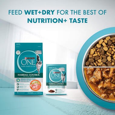 PURINA ONE® Wet Cat Adult Hairball Control with Chicken supports your cat’s overall immunity with IMMUNE DEFENCE PLUS+ and a specialty blend of beta glucans, Vitamins A & E, and Omega 6 fatty acids.